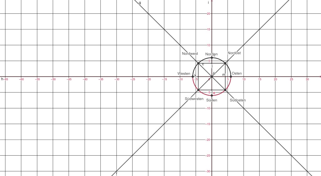 Durch den Kreismittelpunkt zeichnet man noch eine Gerade im Winkel 45° zur Horizontalen ( West-Ost Richtung ) und eine im Winkel 45° zur Horizontalen ( Ost/West Richtung ). Die Schnittpunkte dieser schrägen Geraden mit dem Kreis verbindet man.